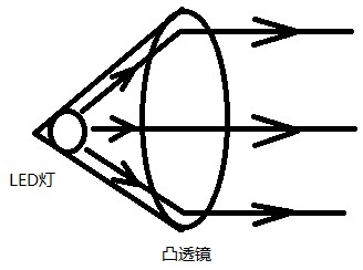 為了解決由于距離近無法看清圖像的問題,我利用用凸透鏡把每個LED燈的光線都由發散光聚焦,但并不是聚焦為平行光,而是仍略有發散,使人眼能夠看清圖像。這樣做的目的是防止不同使用者戴眼鏡位置不同而可能發生的看不清圖像的問題。如圖: