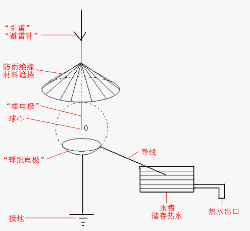 如圖7,可以在“雷擊村”,或其他發(fā)生“閃電”較多的區(qū)域,并且遠(yuǎn)離居民區(qū)的地方,放置一些大大小小的“棒電極——球冠電極”。“棒電極”樹立于空中,用于招引閃電,類似于“避雷針”,但必須與其接地的支撐物絕緣,并且深入到“球冠電極”球心的頂端部位,越細(xì)越好——越細(xì)激發(fā)的“球狀閃電”的能量越大。“球冠電極”的頂端接地,在其邊沿接一導(dǎo)線引入水槽,在閃電放電時,產(chǎn)生的“球狀閃電”可以沿導(dǎo)線進(jìn)入水槽,“球狀閃電”所含的部分能量——熱能可以加熱水,這樣“閃電”的能量,就可以通過“接轉(zhuǎn)”為“球狀閃電”,再把可以“暫時儲存能量”的“球狀閃電”的部分能量——熱能傳給水,人們就可以利用熱水用于工業(yè)生產(chǎn)或日常生活了。
