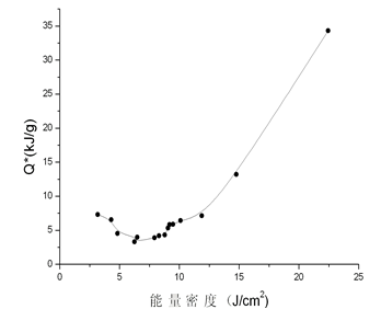 如圖3-5所示,單位面積除漆質(zhì)量先是隨著能量密度上升,在能量密度為6~8 J/cm2之間達到峰值,隨后下降。當激光能量密度大于12 J/cm2后,單位面積除漆質(zhì)量顯著下降,此時,激光與樣品表面的作用機理可能已發(fā)生突變。而進一步分析Q*值(Q*=激光能量密度/單位面積除漆質(zhì)量)隨能量密度的變化曲線,如圖3-6所示??梢钥闯?,當能量密度大于10 J/cm2后,Q*值隨著激光能量密度的提高大幅提高,說明激光能量的利用效率顯著下降。且在入射激光能量密度為6.5 J/cm2時,Q*值為極小值,約為3 kJ/g。