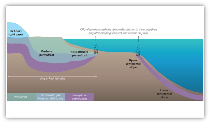 全球變暖,海洋中,深度在2000米以內(nèi)的海水升溫,將導致在陸坡上存在的可燃冰(固態(tài)甲烷水合物)釋放,空氣中的甲烷會迅速氧化成二氧化碳,使二氧化碳濃度急劇增加。